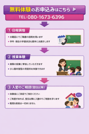 入塾後50番以上順位が上がった塾生もおります。マンツーマンにちかい指導で第一志望合格を目指します。とにかく丁寧に、責任を持って教えますので、関心のある方はご遠慮なくお問い合わせください。